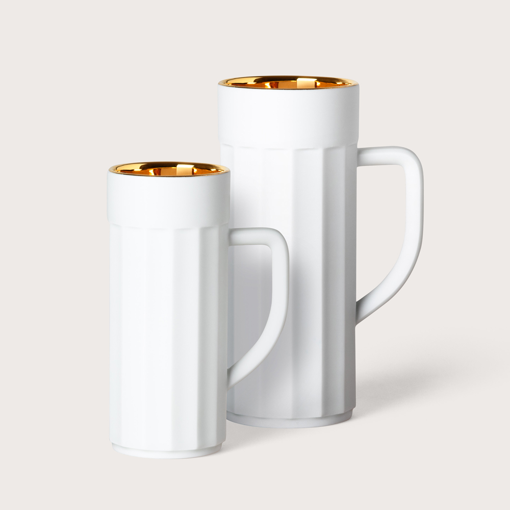 Außen mattsatiniert, wird die besondere Qualität des handgefertigten Porzellans sicht- und spürbar. Die Bierkrüge Of Kings & Queens sind in den zwei Volumengrößen 0,33 und 0,5 Liter erhältlich und liegen dank des schmalen, fein geformten Henkels optimal in der Hand.