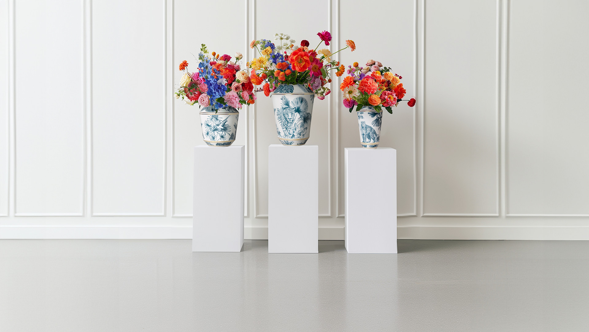 Our new porcelain vases from SIEGER by FÜRSTENBERG bring the beauty of nature into the home. With their 360-degree panoramas of tropical plants and wild animals, they’re a stylish way to present flowers, whether individually arranged or as a lavish bouquet. The colour palette comprises subtle, timeless blue-grey shades and is refined with 24-carat gold.
