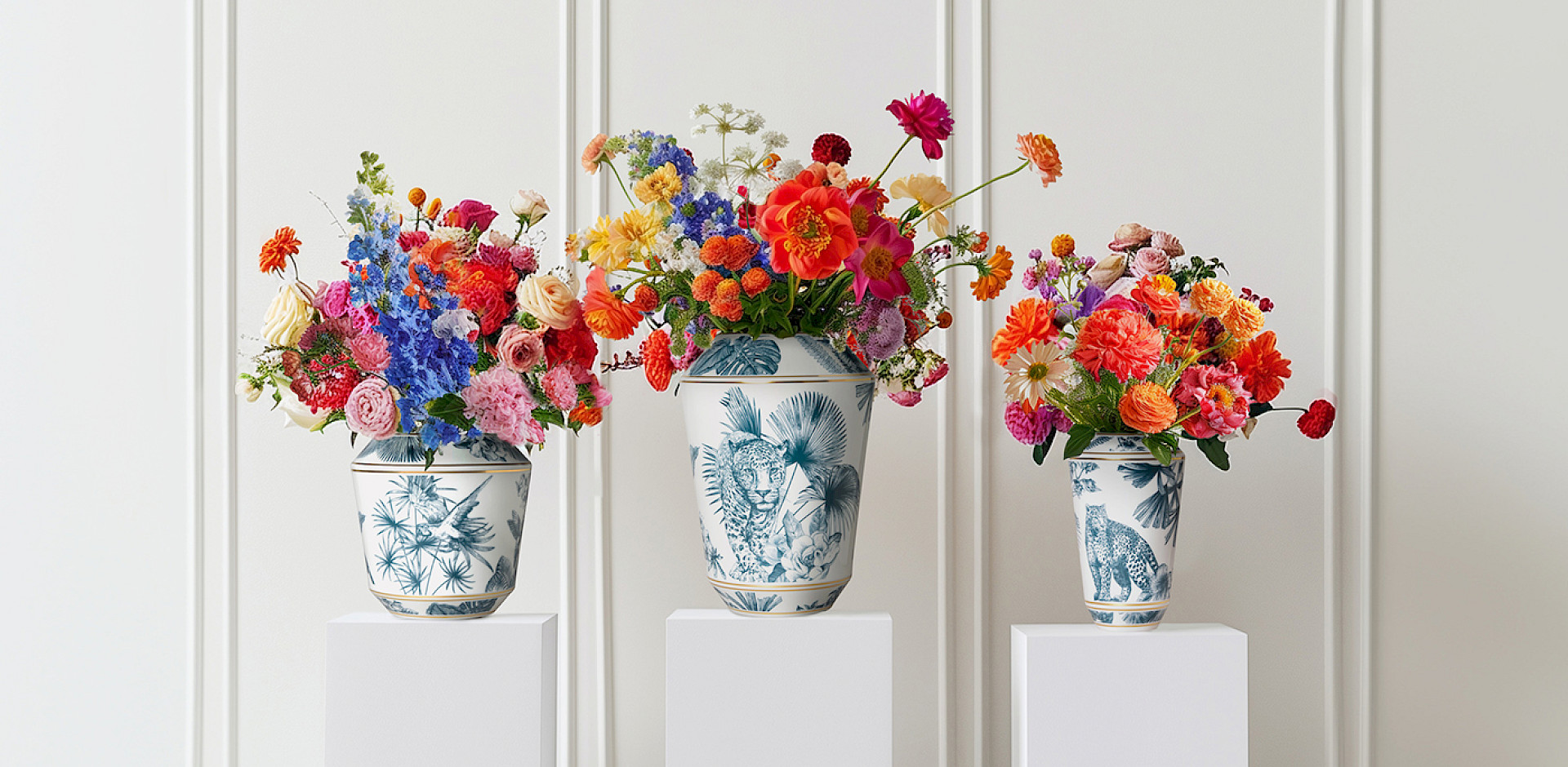 The new Paraíso Blue porcelain vases from the Luna collection bring the beauty of nature into the home. With their 360-degree panoramas of tropical plants and wild animals, they’re a stylish way to present flowers, whether individually arranged or as a lavish bouquet. The colour palette comprises subtle, timeless blue-grey shades.