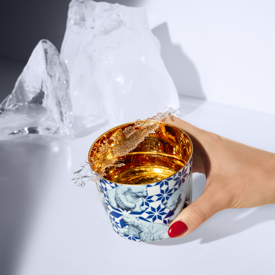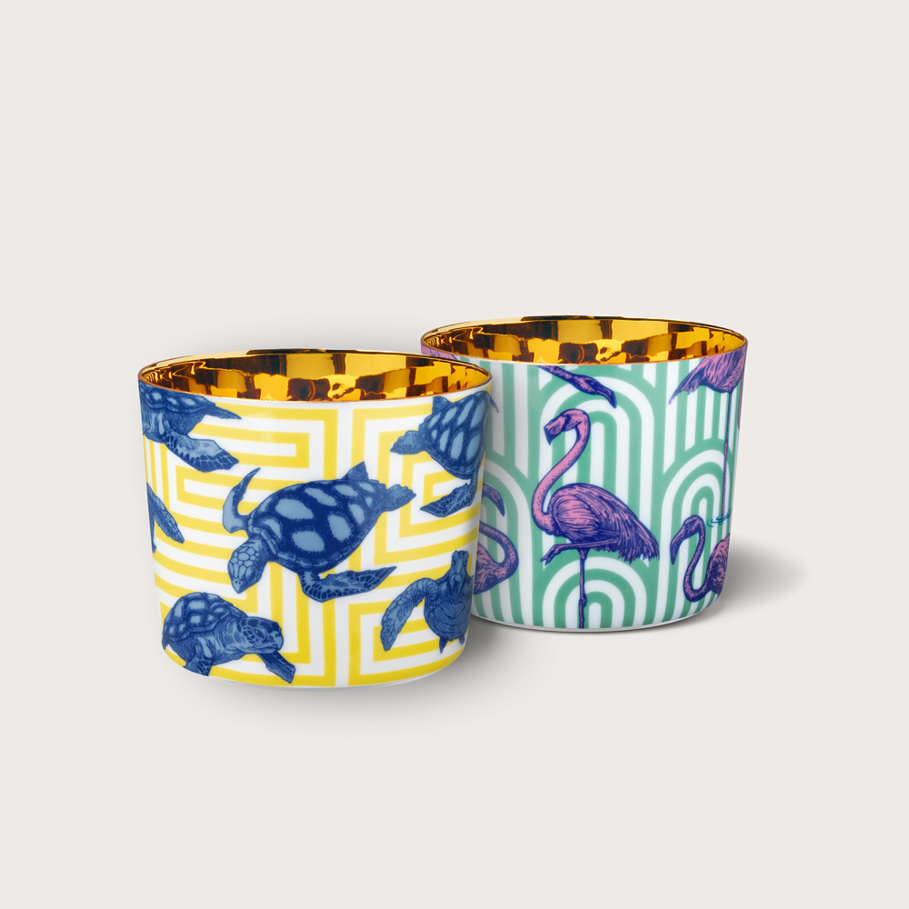 These wafer-thin porcelain tumblers with gold-plated interiors are colourfully decorated with animal species like elephants, polar bears, octopuses and flamingos, and have been designed with loving attention to detail. Against the patterned backgrounds, the animals stand out with their own distinctive character. The Beautiful Creatures tumblers are a part of champagne tumbler collection Sip of Gold.