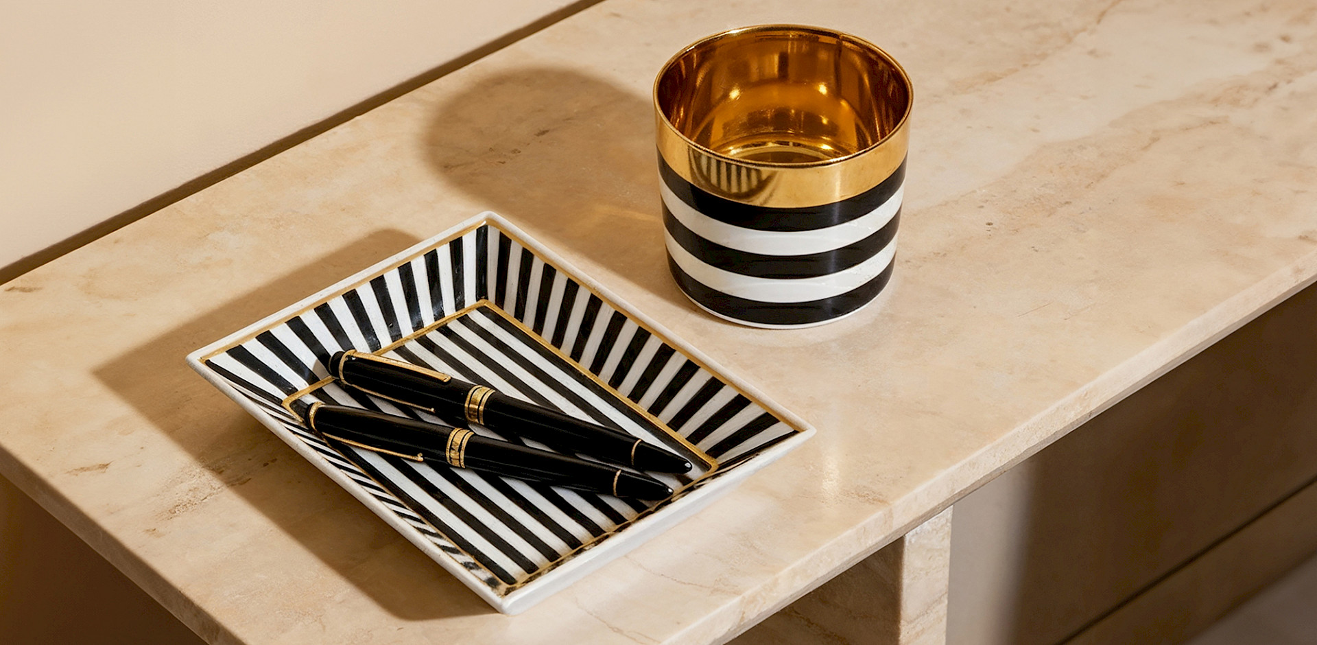 Die Accessoire sind in feinster Handwerkskunst gefertigt und mit vier Dekoren veredelt. So elegant, dass sie selbst als Sammelstelle für kostbaren Schmuck oder als Bühne für Petit Fours dienen – der Fantasie sind keine Grenzen gesetzt.