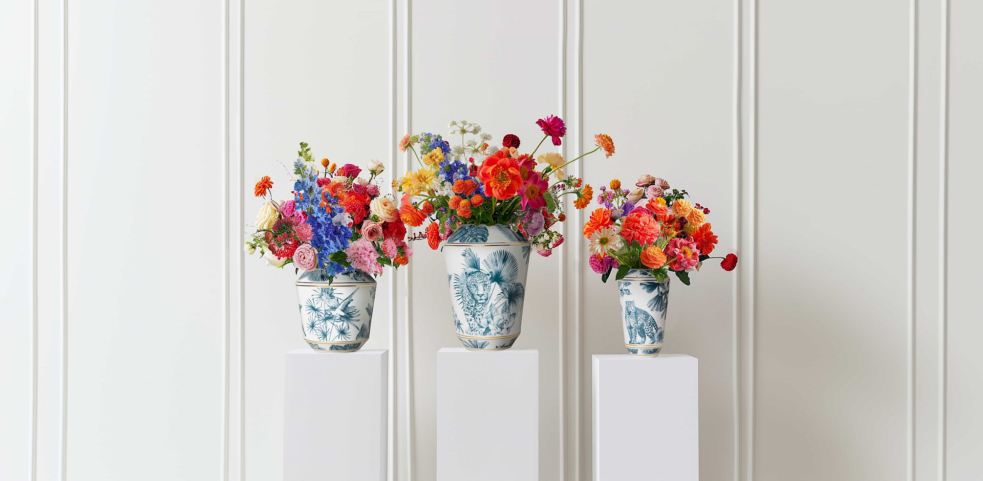 Unsere neuen Porzellanvasen bringen die Schönheit der Natur in das Zuhause. Mit ihren 360-Grad-Motiven von tropischen Pflanzen und wilden Tieren inszenieren sie Blumen stilvoll, gleich ob einzeln arrangiert oder als prächtiger Strauß. Der Dekor ist farblich in einem dezenten, zeitlosen Blaugrau gehalten und mit 24-karätigem Gold veredelt.