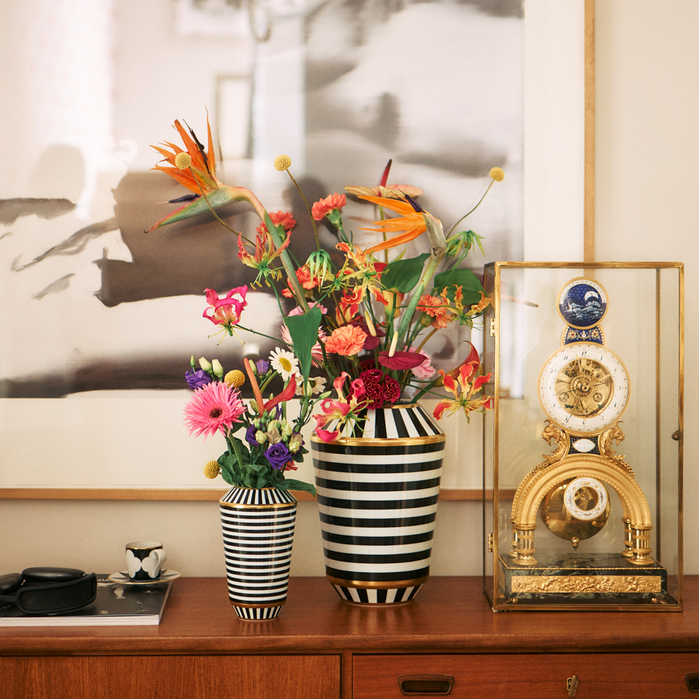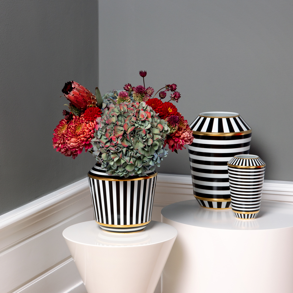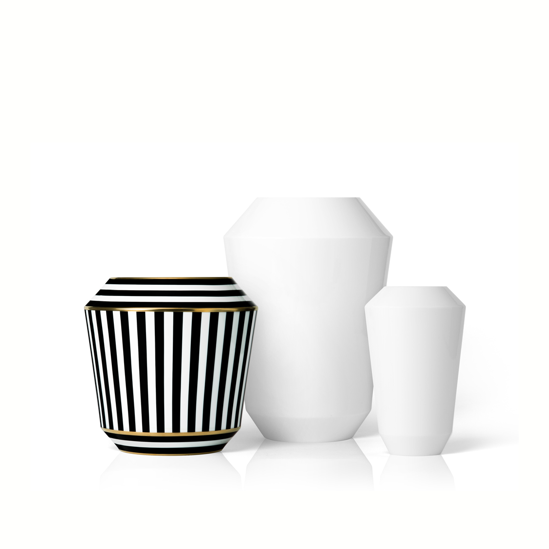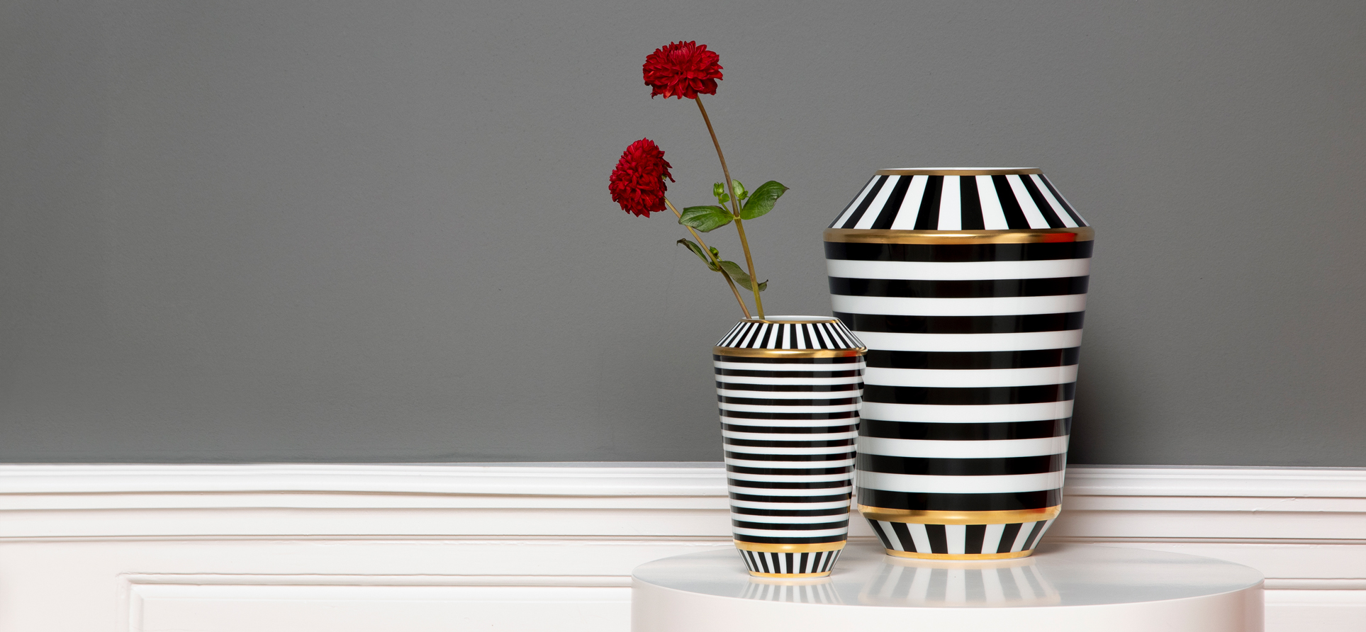Die skulpturalen Vasen von SIEGER by FÜRSTENBERG gibt es in den Höhen 203mm, 215mm und 325mm. Sie sind in purem Weiß, mit einem schwarz-weißen Streifenmuster sowie mit dem Dekor Paraíso Blue erhältlich.