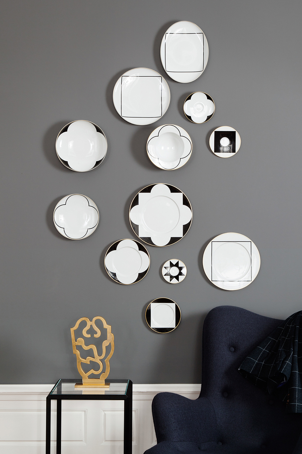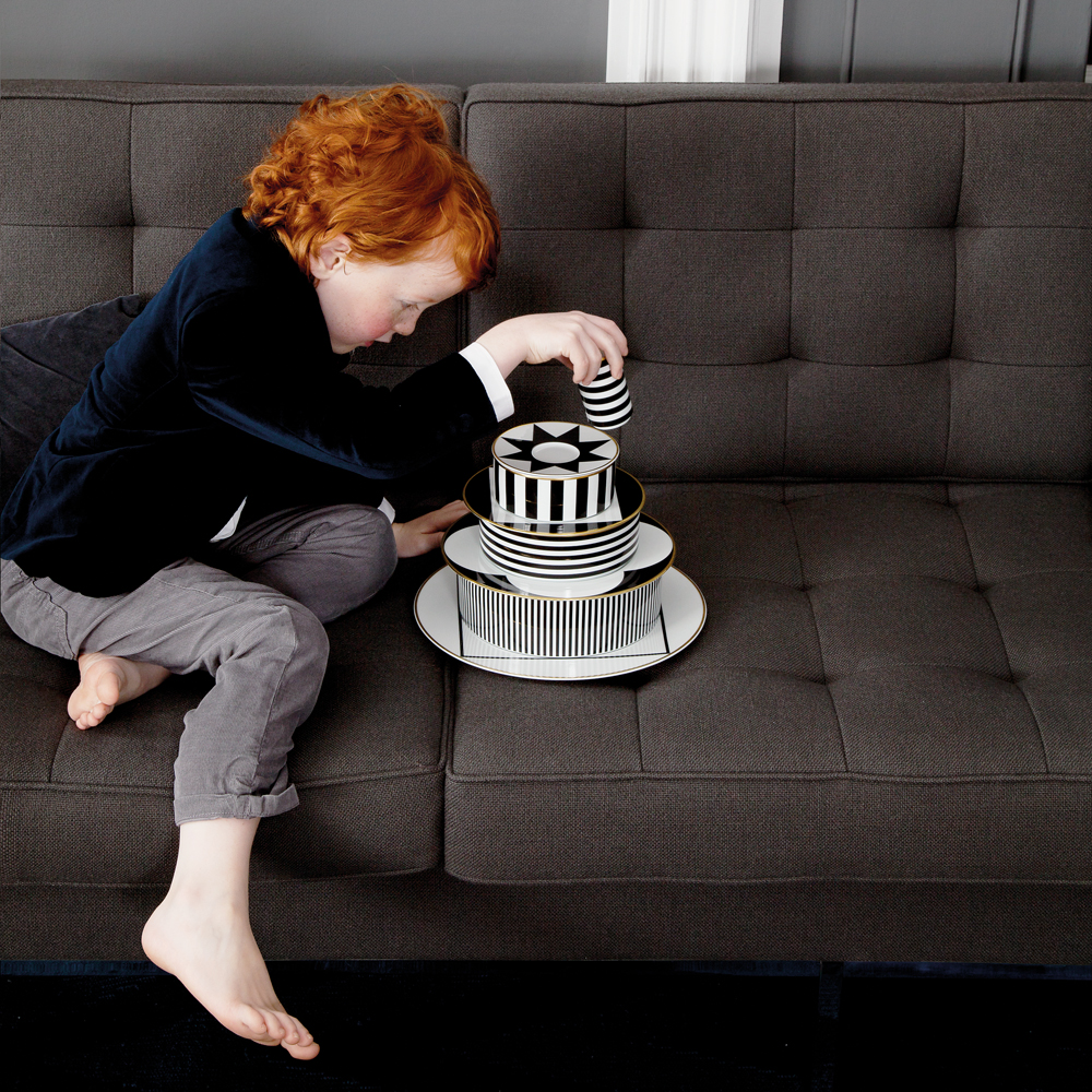 Minimalistisch und doch opulent – für Ca’ d’Oro veredelt feinstes Poliergold pure Schwarz-Weiß-Kontraste. Im Spiel der Geometrien zeigen sich klassische Streifen, Quadrate, Kreise und weitere Muster, die architektonisch anmuten.