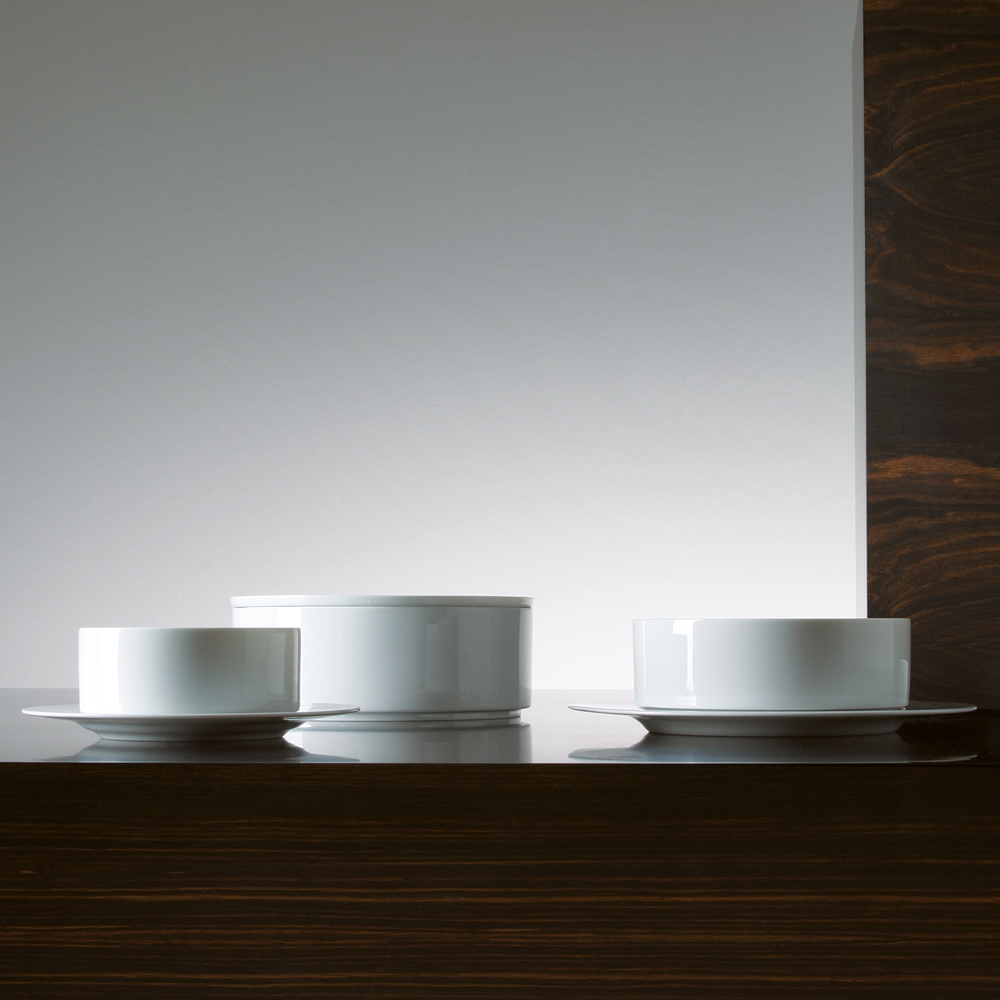 Die konische Form orientiert sich an der asiatischen Kultur und Küche. Reduziert gestaltet, lassen sich Teeschälchen ohne Henkel, passende Cloches und eine kleine Auswahl weiterer Teile kombinieren.