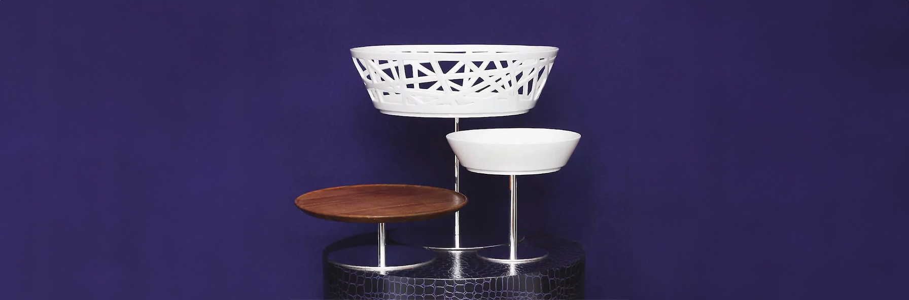 MY CHINA! erhebt sich. Das modulare Buffetsystem entspricht den Maßen des Tafelservice und kann mit Tellern, Schalen und Accessoires kombiniert werden. In drei unterschiedlichen Höhen und Durchmessern bilden die Edelstahl-Standfüße mit dem Porzellan oder Nussbaumholz einen schönen Material-Mix.