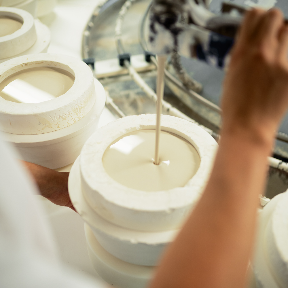 Alles beginnt mit detailreichen Entwurfszeichnungen, die mit hohem handwerklichen Können in dreidimensionale Gipsmodelle übertragen werden. Anhand dieser Modelle werden Gipsformen erstellt, in die schließlich die flüssige Porzellanmasse gegossen wird. Innerhalb kurzer Zeit entzieht die poröse Gipsform der Porzellanmasse so viel Feuchtigkeit, dass ein lederartiger Porzellanrohling entsteht. In liebevoller Handarbeit wird jeder Rohling mit Schwämmen und Messerchen geputzt, um makellose Oberflächen zu erhalten. Erst danach erfolgen der erste Glühbrand sowie die Glasur.