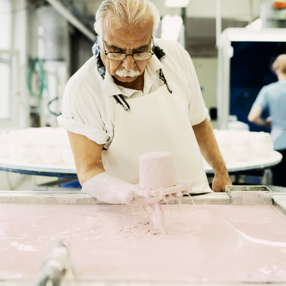 Die Feinheit und exakte Passgenauigkeit des MY CHINA! Tafelservice verlangt besonderes handwerkliches Können und Fingerspitzengefühl. Aufgrund der Wandstärke, die stellenweise nur zweieinhalb Millimeter misst, ist ein herkömmlicher Glasurvorgang der Tassen und Schalen im Hand-Bad, bei dem jedes Teil einzeln per Hand in die flüssige Glasur getaucht und geschwenkt wird, nicht möglich. Für das hauchdünne Porzellan ist es daher erforderlich, eine Sprühglasur auf jeden Artikel einzeln aufzutragen. Bei dem anschließenden Glattbrand bei bis zu 1.400 Grad erhält das Porzellan seine berühmte Härte. Rein weiß schimmernd verlassen die neuen Porzellanstücke den Brennofen.