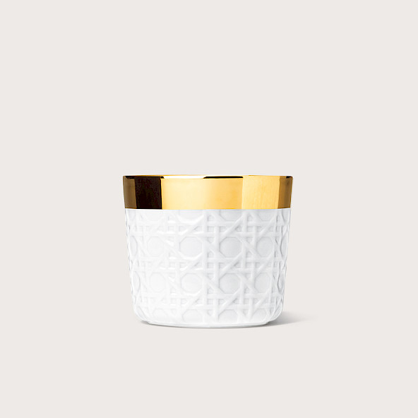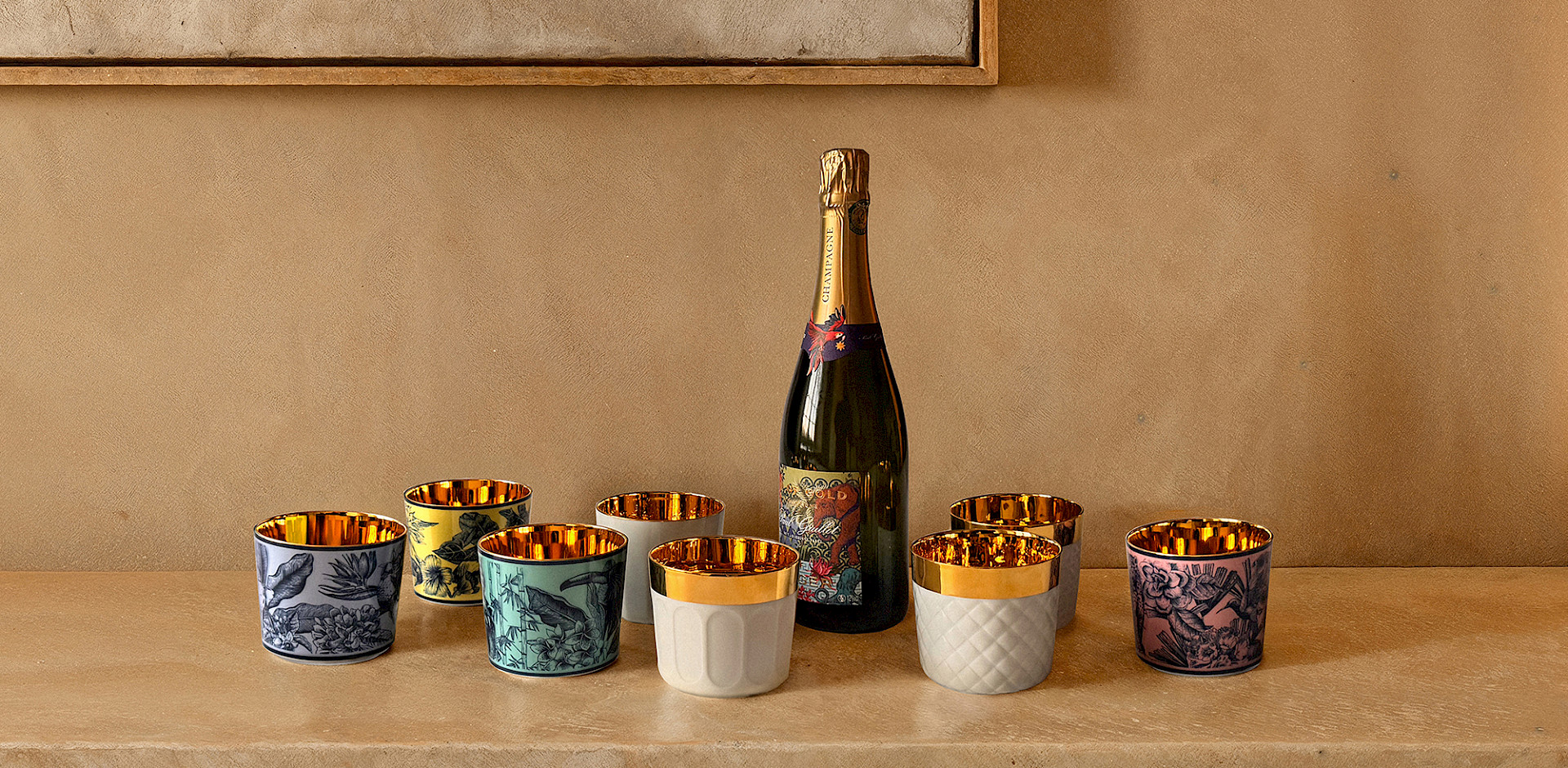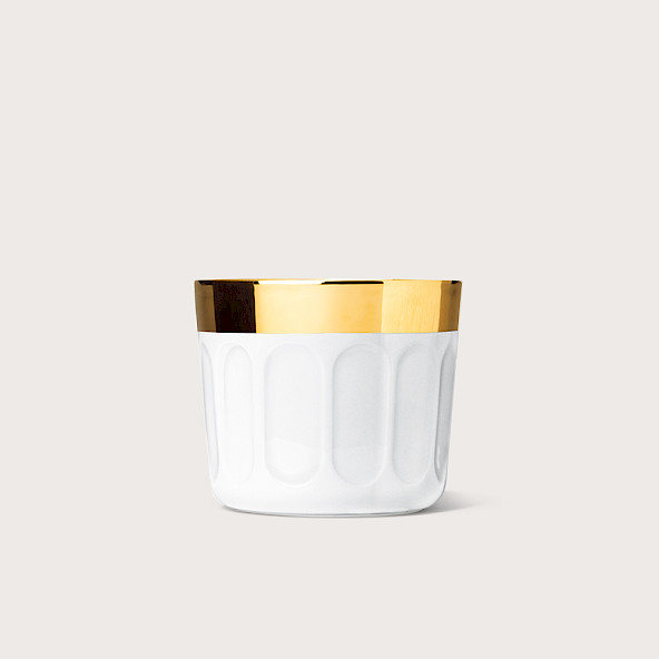 Die Champagnerbecher Sip of Gold von SIEGER by FÜRSTENBERG verbinden feinstes Porzellan mit glänzendem Edelmetall, das im Zusammenspiel mit einem Getränk Hunderte von Reflexionen erzeugt. So entsteht der namensgebende Eindruck flüssigen Goldes.